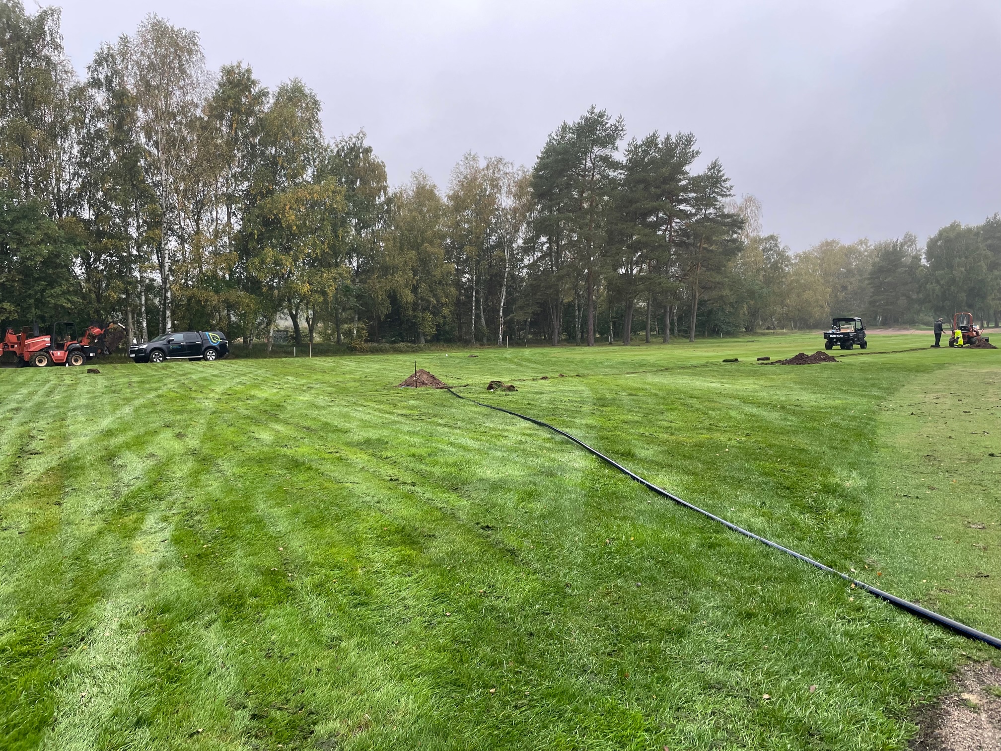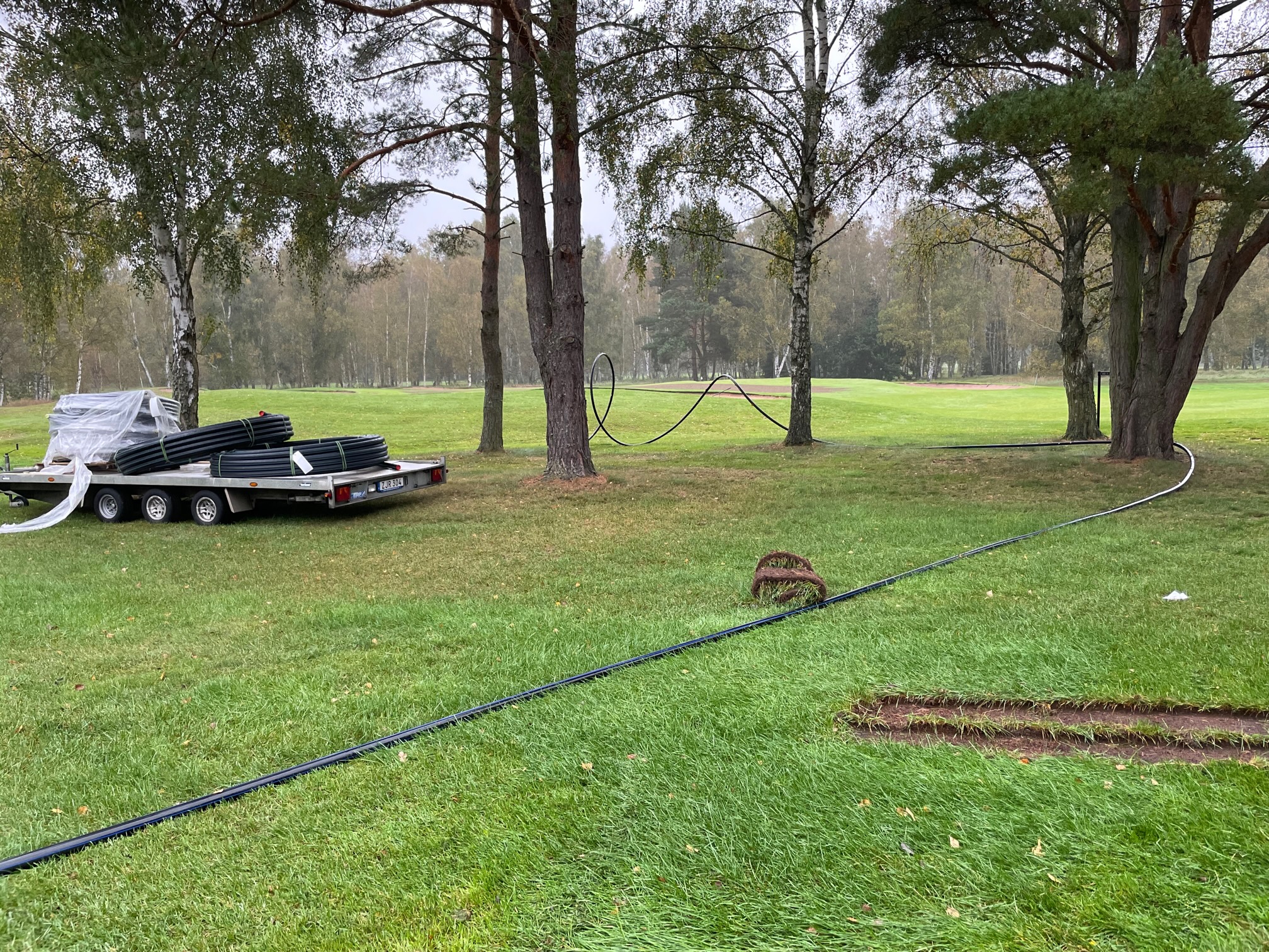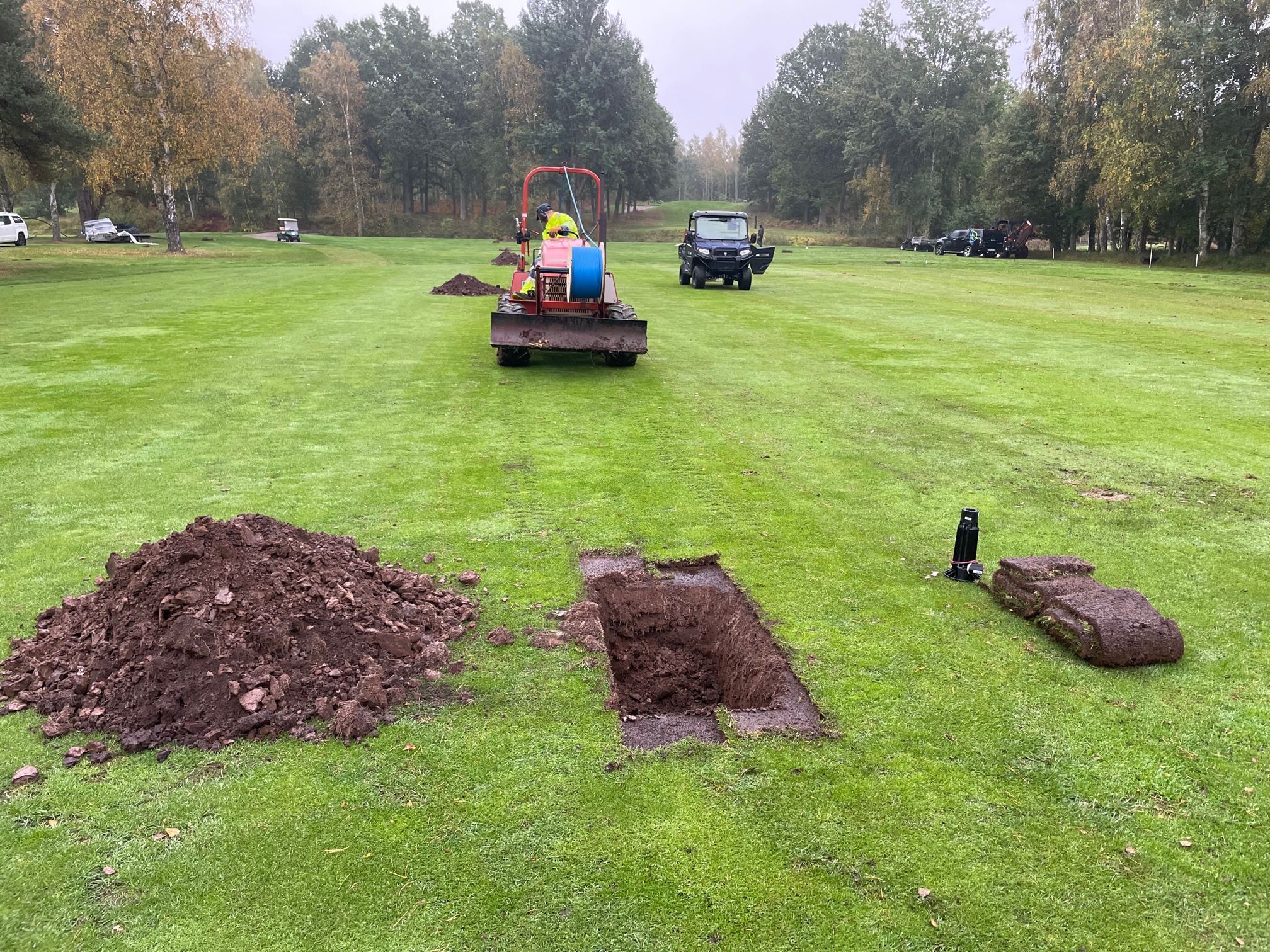 Arbetet med bevattningssystemet fortlöper enligt plan. Hål 5-8 är klara sen 11-16 är också klara. Kan nämnas att planen är att jobba sig bort från dom blöta hålen innan det blir för blött. Just nu jobbas det på hål 10. Bild 3-4 visar före och efter installation.